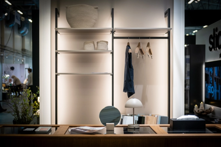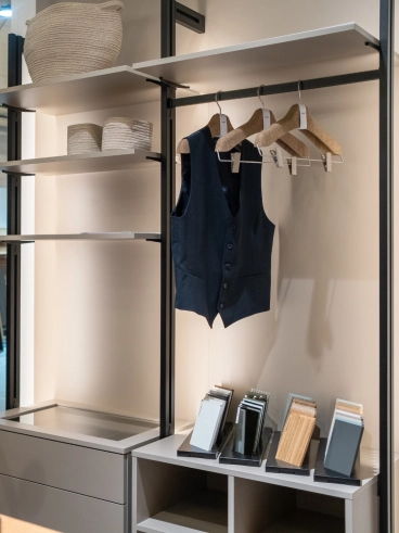 With its clean design and flexible structure, Zero fits perfectly in both compact wardrobes and open dressing rooms. Shelves and hanging rails can be adjusted or repositioned at any time using an adjustment tool, without the need for disassembly.
