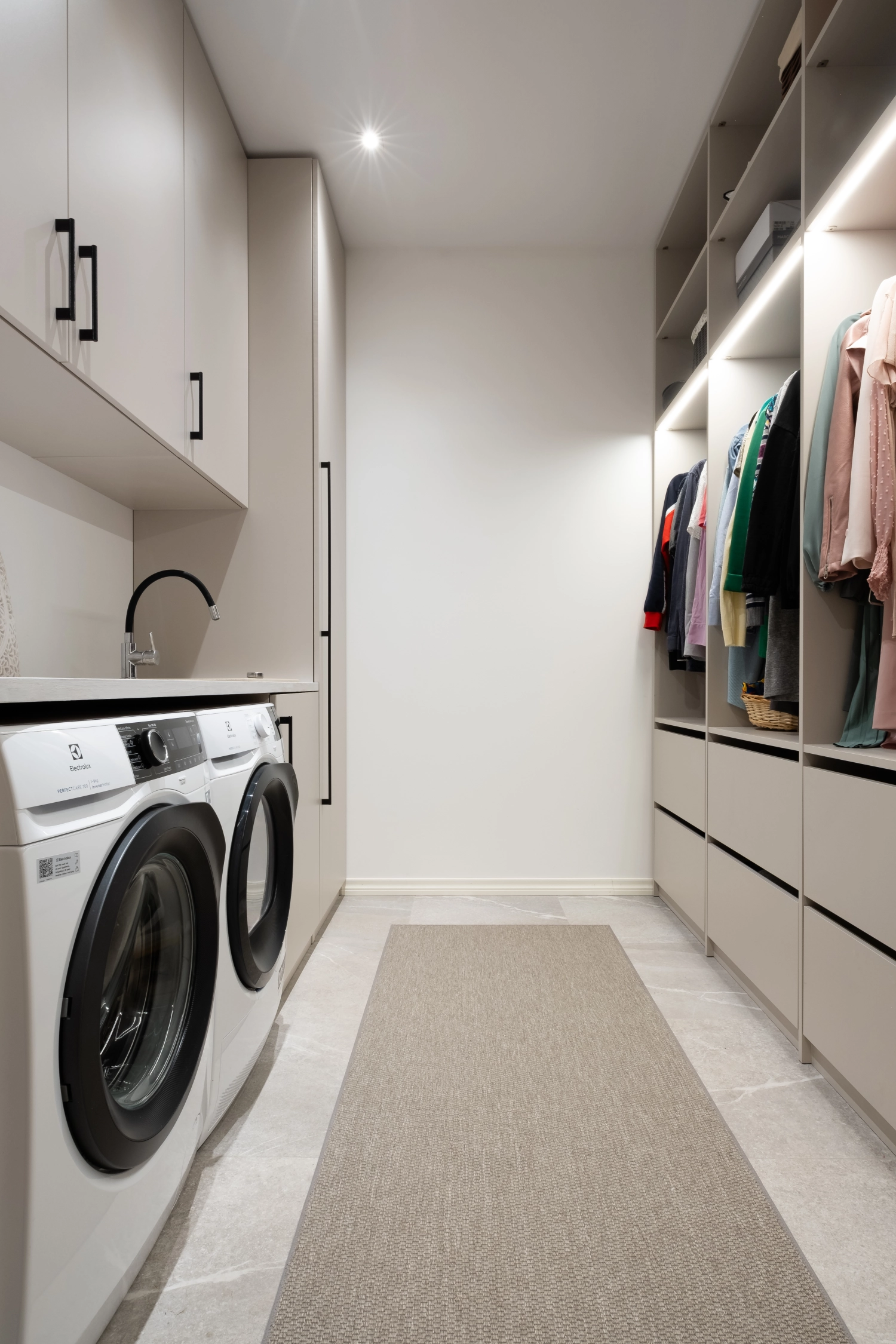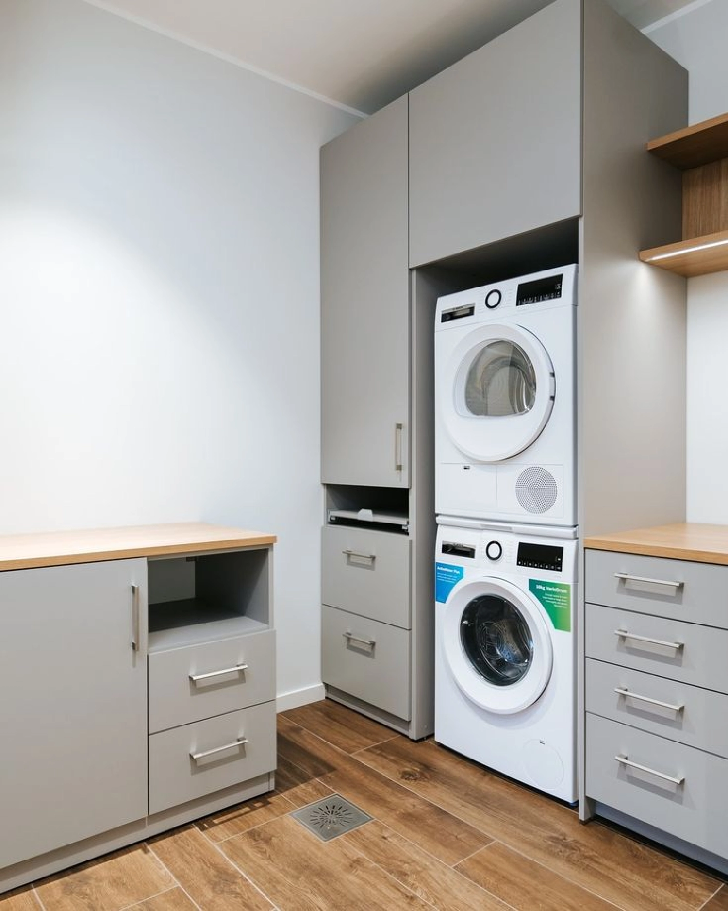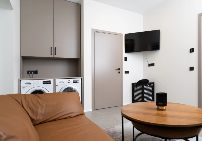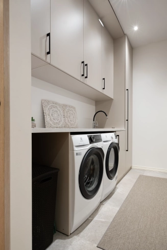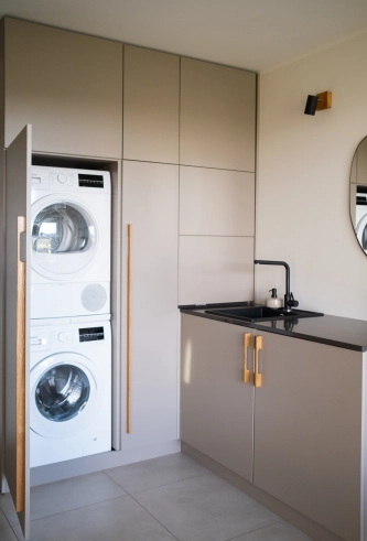 Valmistamme mittatilaustyönä kaapistoja pesukoneille ja kuivausrummuille sekä korkeita säilytyskaappeja, joissa pesuaineet ja siivoustarvikkeet pysyvät siististi piilossa. Käytännöllisten ratkaisujen ansiosta pienikin kodinhoitotila voidaan muuttaa selkeäksi ja toimivaksi kokonaisuudeksi.